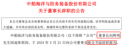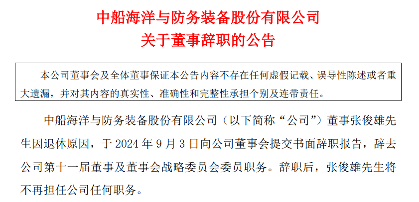 中船防务董事张俊雄辞职,4个月前另一董事曾突然辞职
