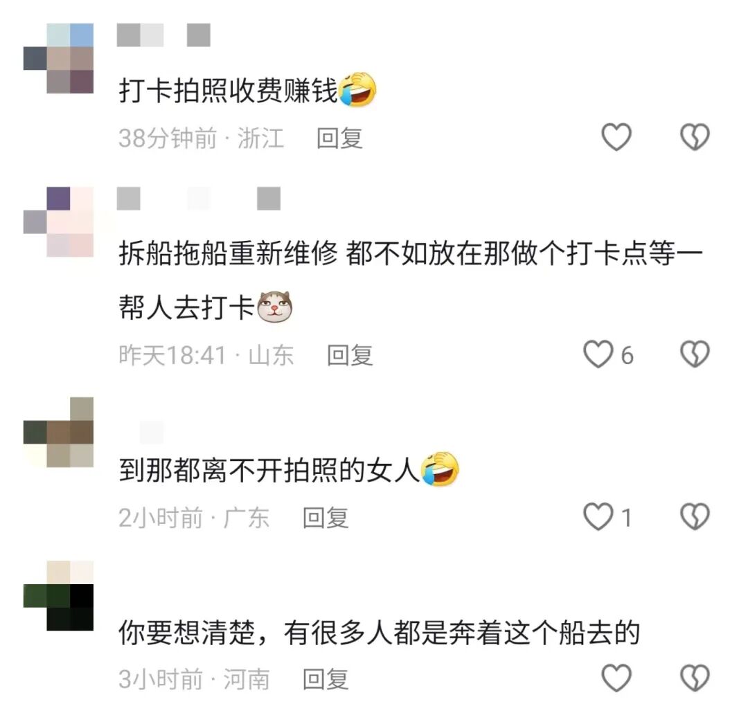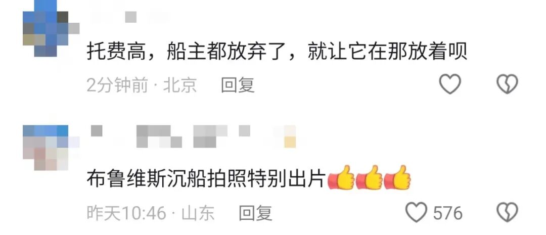 众多人留言对这艘船表达了不舍,表示“别拖走啊,我还没去呢”。还有人称“拆穿拖船重新维修,都不如放在那做个打卡点等一帮人去打卡”“托费高,船主都放弃了,就让它在那放着呗”等等。这些言论不仅反映了民众对这艘货轮的情感,也间接揭示了其作为旅游景点的商机。