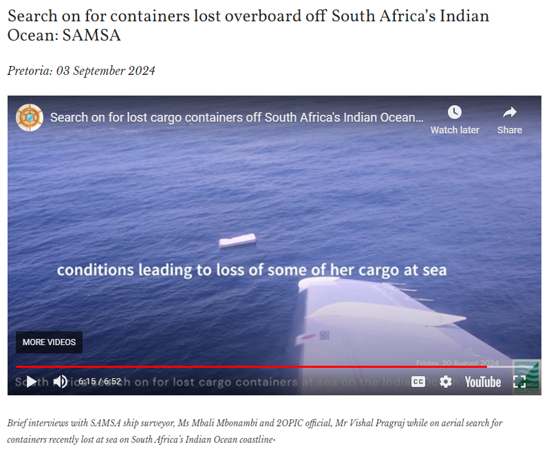 上周五(8月30日),该船的保险公司的南非代表在南非东开普省的野生海岸地区多次发现漂浮的集装箱后,迅速启动了长达五小时的空中监视与搜寻任务,旨在找回该船遗失的集装箱。