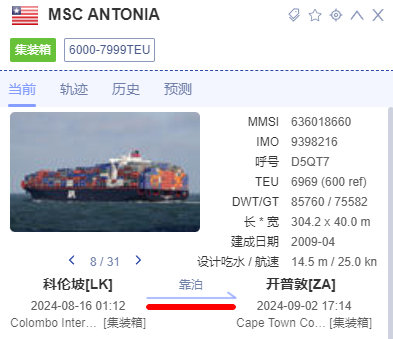 南非海事安全局 (SAMSA) 表示,8月28日,悬挂利比里亚国旗的“MSC Antonia”号在南非印度洋走廊沿岸丢失了46个集装箱,另有305个集装箱遭到损坏。SAMSA已针对该情况发布了航行警告,并公开呼吁公众,一旦在南非海岸线发现这些集装箱,请立即上报相关信息。