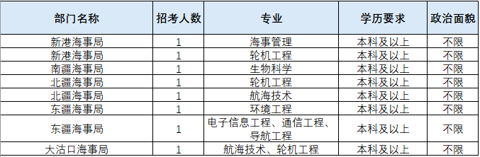 长江海事局明确说明将从事基层工作的岗位数仅占全部招收岗位的6.9%,海南海事局明确说明将从事基层工作的岗位数占其全部招收岗位的58%。辽宁、河北、山东、福建、广西、深圳和连云港海事局招收岗位全部为基层岗位。