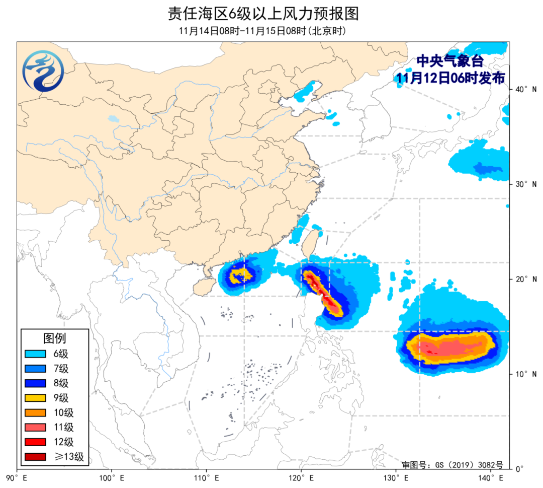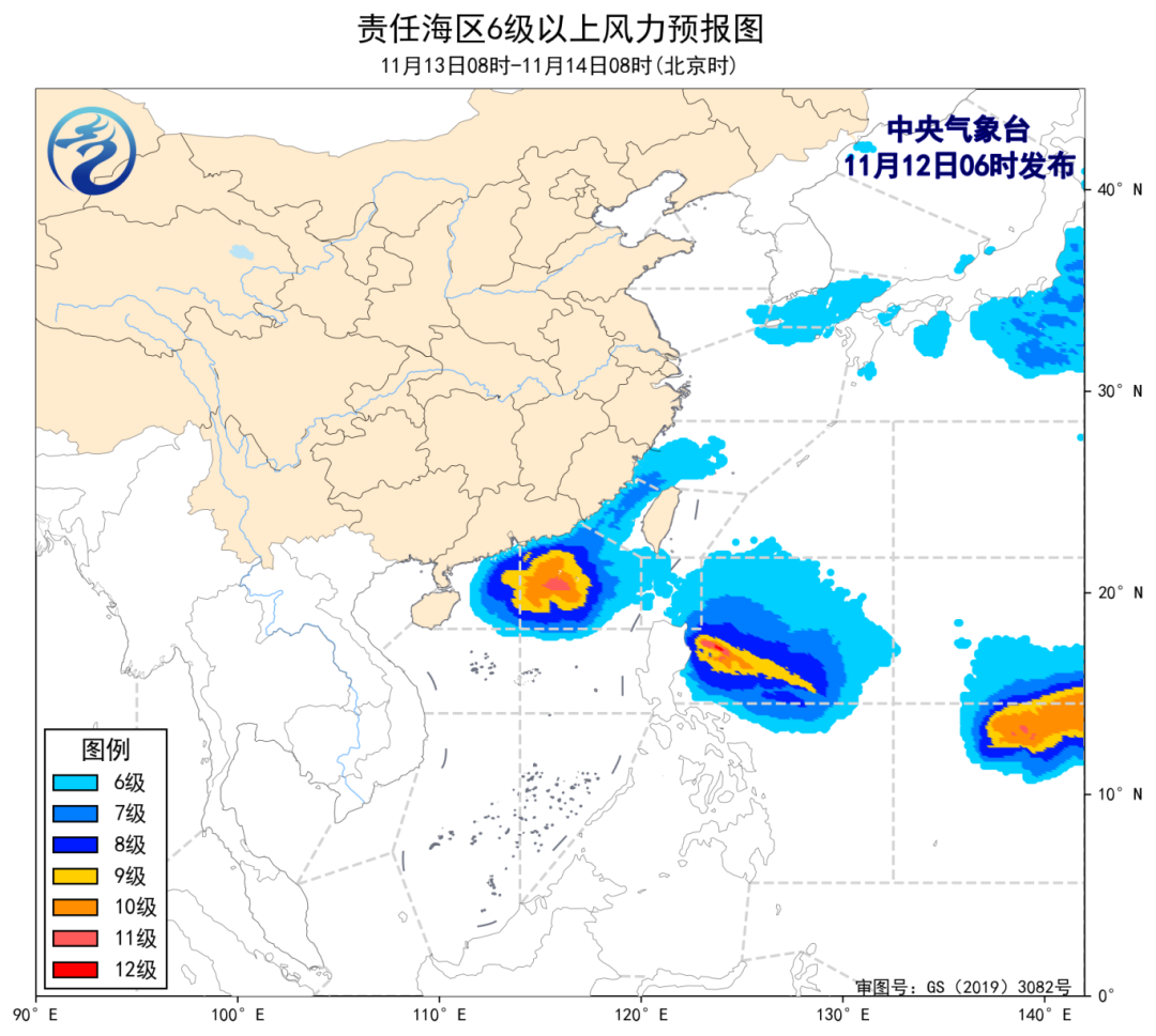 11月11日14时至12日02时,东海南部海域、台湾以东洋面、南海西北部海域出现了5~6级、阵风7级的东北风或偏东风,台湾海峡出现了6~7级、阵风8级的偏北风,巴士海峡、南海东北部海域、南海中西部海域出现了6~8级、阵风9级的东北风或偏东风。