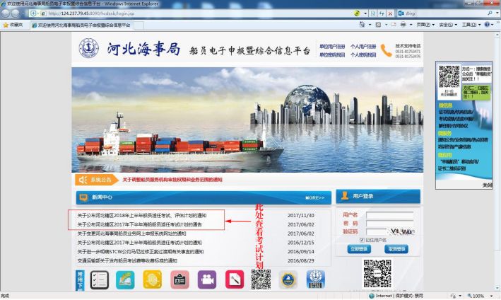 以适任考试报名为例(合格证考试由培训机构报名,在这不做赘述),首先登录河北海事局船员电子申报暨综合信息平台,网址:http://124.237.79.45:8090/hcdzsb/login.jsp。什么?太长记不住?那好,还有快捷方式进入,网页搜索河北海事局官网(网址:http://www.hbmsa.gov.cn),在首页中有船员电子申报暨综合信息平台快捷登录接口(见下图)。为了方便后续使用,建议把网址收藏在IE浏览器收藏夹。