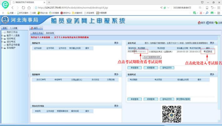 打开河北海事局船员电子申报暨综合信息平台后,请注意左侧内容(见下图),我们会每半年更新河北辖区船员适任考试计划,船员朋友可根据考试计划安排参考行程。特别注意:半年考试计划为计划时间,实际可能根据工作情况,临时调整时间,请以每期考试发布考试信息为准,考试报名时间为考试开始前20天至10天。