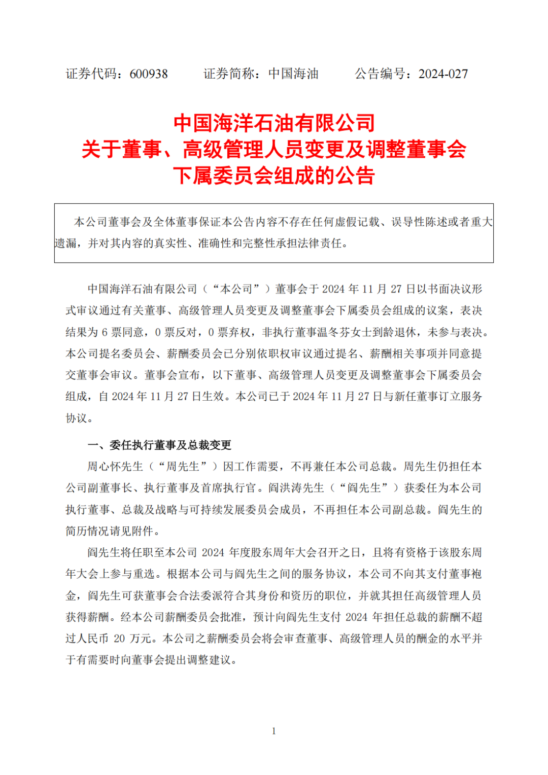 11月27日,中国海洋石油有限公司发布《关于董事、高级管理人员变更及调整董事会下属委员会组成的公告》: