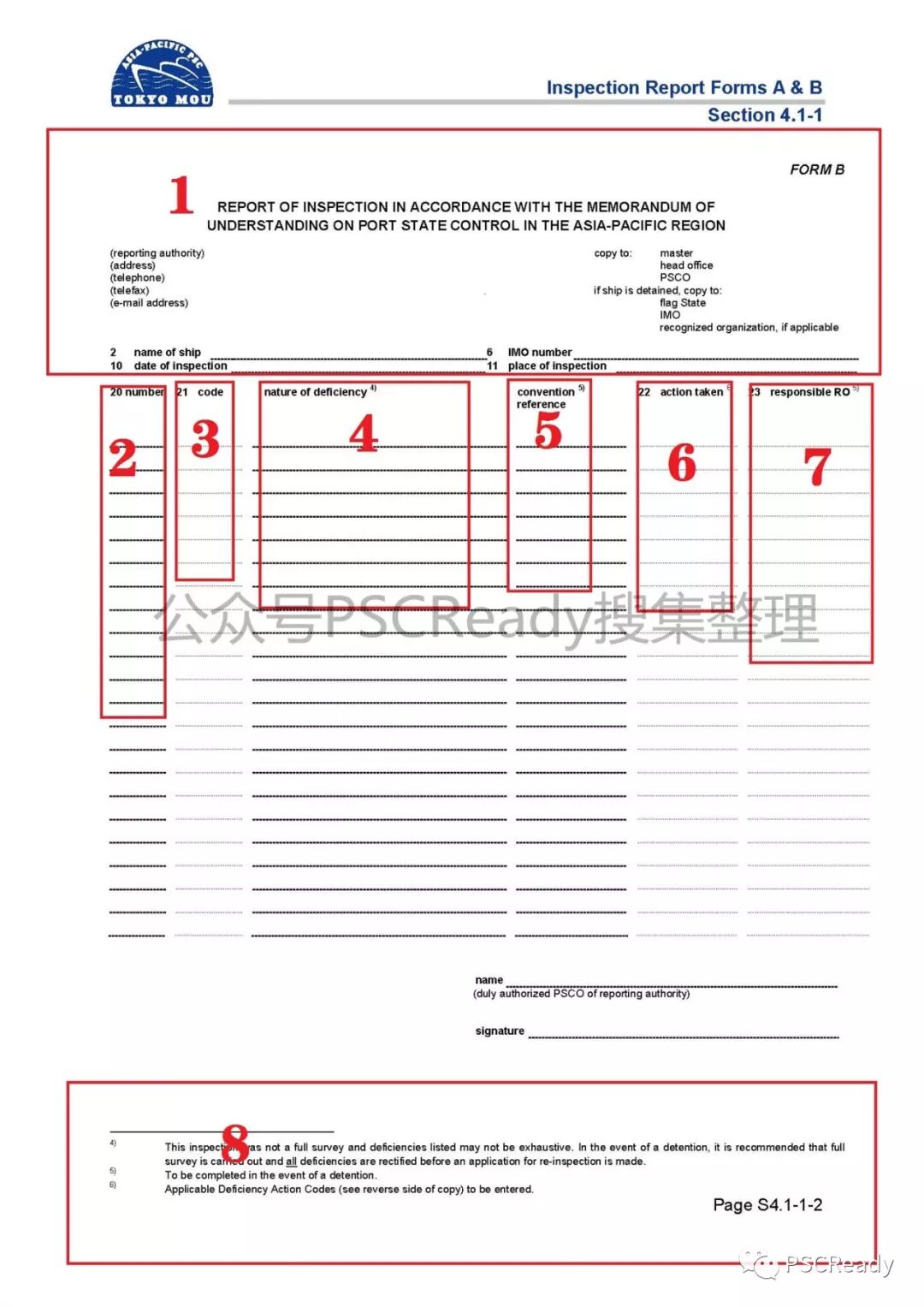 Form B记录了PSC检查的缺陷情况,如何处理以及处理时间,PSCReady将这个模板分成了8个部分,需要注意的部位重点介绍。