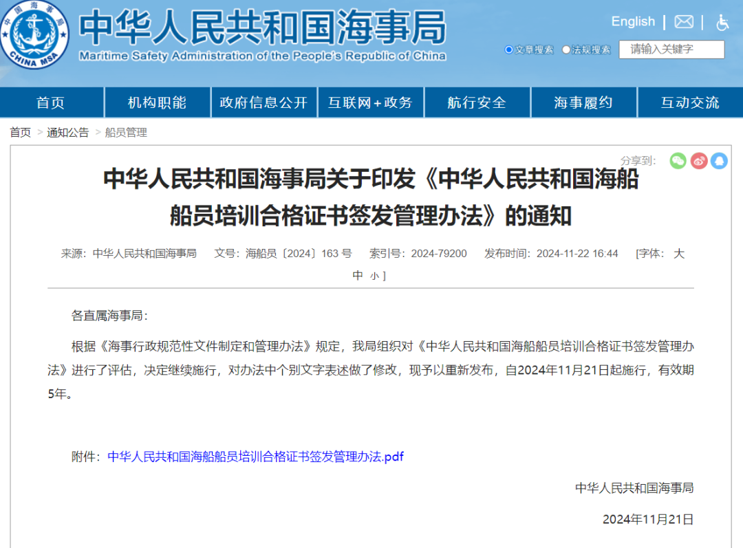 根据《海事行政规范性文件制定和管理办法》规定,我局组织对《中华人民共和国海船船员培训合格证书签发管理办法》进行了评估,决定继续施行,对办法中个别文字表述做了修改,现予以重新发布,自2024年11月21日起施行,有效期5年。附件:中华人民共和国海船船员培训合格证书签发管理办法中华人民共和国海事局2024年11月21日