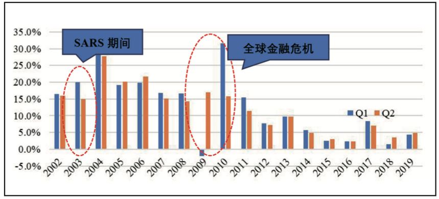 除去2008-2009年全球金融危机,我国港口最大的季度波动发生在2003年SARS期间。SARS事件集中发生于4-5月份、集中在北京和广东等区域,对港 口的影响主要在第二季度,从2003年我国港口总吞吐量和集装箱吞吐量的季度增速对比发现,第二季度比第一季度的增速分别下跌了5个百分点和22个百分点。考虑到当时我国刚刚加入WTO,经济保持强劲的增长潜力,且本身就处于一个高速增长阶段,所以在后续的下半年增速得到了修正。