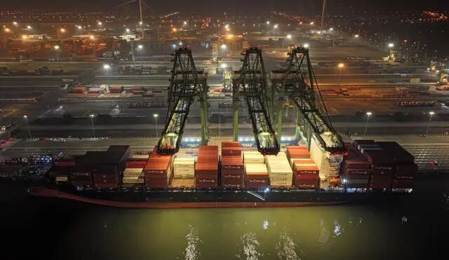 1月16日晚,随着大型集装箱班轮“巴赫”号载着南美洲车厘子驶进天津港,天津港首条直通南美“车厘子快线”正式开通。新华社记者 赵子硕 摄