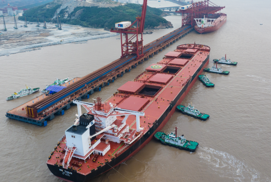 放眼鼠浪湖矿石中转码头,舳舻相接,矿流奔涌。每年,有超1500艘次大小船舶在此停靠、启航,超3700万吨铁矿石通过这个繁忙的枢纽分拨至国内外各地。此次全球首次双40万吨世界最大矿船同靠接卸,不仅为宁波舟山港世界一流强港建设增添强劲动能,也进一步提升了全球最大港服务“双循环”新发展格局的能力。