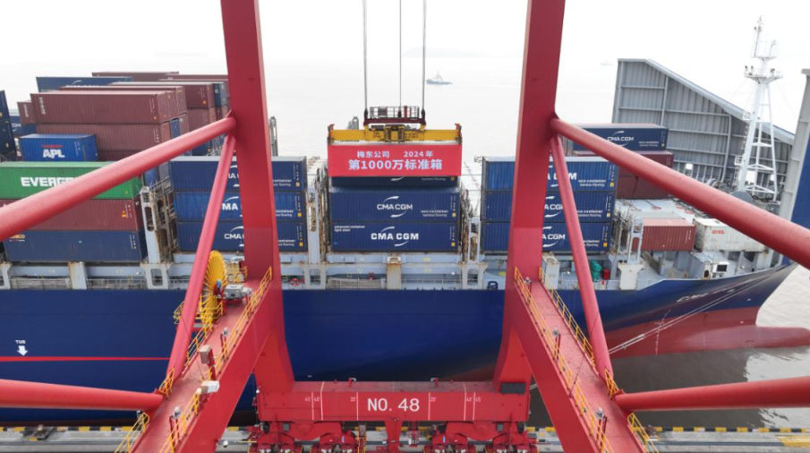 就在9天前,北侧的穿山港区已先一步迎来了其第八个“千万时刻”,较去年超1000万标准箱提前半月有余。