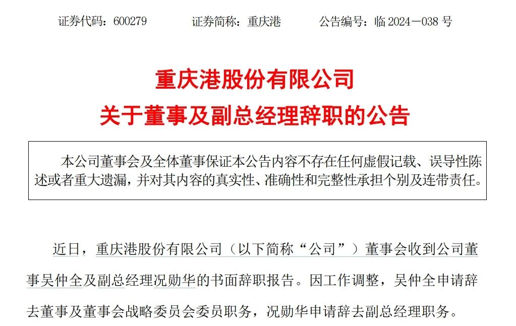 10月14日,重庆港股份有限公司(证券代码:600279,以下简称“重庆港”)发布公告,董事会收到公司董事吴仲全及副总经理况勋华的书面辞职报告。