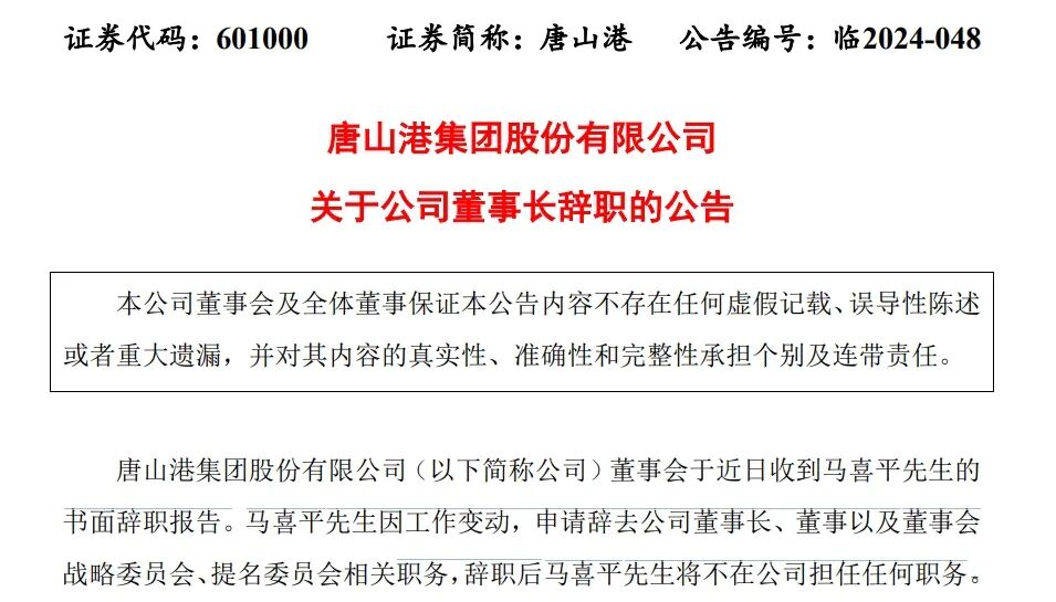 11月20日,唐山港集团股份有限公司(以下简称“唐山港”)发布《关于公司董事长辞职的公告》。
