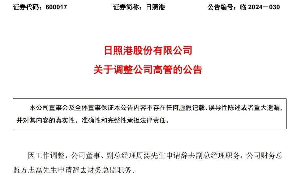 12月23日,日照港股份有限公司(以下简称“日照港”)发布《关于调整公司高管的公告》。 公告称,因工作调整,公司董事、副总经理周涛先生申请辞去副总经理职务,公司财务总监方志磊先生申请辞去财务总监职务。 公司于 2024 年 12 月 23 日召开第八届董事会第十一次会议,审议通过了《关于调整公司高管的议案》,董事会同意聘任张峰先生为公司副总经理,聘任陈磊先生为公司财务总监,聘期至本届董事会任期届满止。