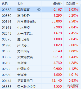港口航运股普涨,其中珠江船务(0560.HK)涨逾3%,中远海控(4.940, -0.08, -1.59%)、太平洋(3.650, 0.08, 2.24%)航运涨逾2%,大连港(2.020, 0.00, 0.00%)、中远海发(2.740, -0.02, -0.72%)、天津港(6.310, 0.02, 0.32%)发展等涨逾1%。