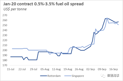 根据船舶经纪公司Arrow近期(19日)提供的一份报告显示,近几周,随着2020年1月1日限硫令实施的最后期限前的准备工作加快,高硫低硫燃料油之间的价差出现大幅扩大的趋势。自本月初以来,新加坡(明年)1月20日0.5%至3.5%的硫燃料油合约价差飙升了21%,从8月30日的每吨208美元升至近期(19日)的每吨251美元。鹿特丹的价格差也出现了类似的上涨,同一时期的高-低硫油价差上涨了27%,从每吨202美元上涨到每吨256美元。事实上,今年大部分时间,1月20日合约价差在每吨170美元至190美元之间波动。对更清洁燃料(硫含量更低)的需求不断增长也反映在炼油利润率上。新加坡gasoil价差飙升至6年来9月份的最高水平。且因最近对沙特阿拉伯石油设施的袭击可能会在未来几周收紧亚洲的供应,利润率可能进一步推高。但同时我们也注意到,尽管航运业开始转向使用清洁燃料正在进一步的扩大价差,提高炼油行业的利润率,但新加坡的重油供应紧张正推高现货价格。380cst HSFO货轮的现金溢价此前曾飙升至每吨61.6美元的创纪录高点,高于上周早些时候新加坡的报价。因为市场存在严重的现货溢价,贸易商没有向该地区发货,HSFO 也出现了供应紧张的局面。且因为沙特阿拉伯的出口预计会因此前的恐怖袭击而下降,在未来一段时间里,供应可能会变得更加紧张。然而,随着航运业完成向清洁燃料的转变,现金价格预计在未来几个月将会下降。目前,1月20日新加坡380 HSFO的合同价格为每吨257美元。相比之下,目前新加坡的这一价格为每吨540美元。沙特空袭恐加速船东换油
