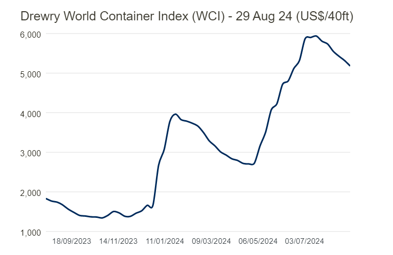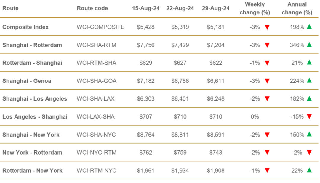 Drewry最新发布的取消航次评估数据显示,从第36周(9月2日至9月8日)至第40周(9月30日至10月6日)的五周内,跨太平洋、跨大西洋及亚洲至北欧和地中海的主要贸易航线总共有696个预定航次,其中68个航次已经宣布取消,取消率为10%。具体而言,跨太平洋东行航线取消的航次最多,占比51%;亚洲至北欧和地中海航线占28%;跨大西洋西行航线占21%。在接下来的五周内,THE联盟取消了17个航次,海洋联盟和2M联盟则分别取消了12个和10个航次,非联盟船公司则取消了 29个航次。今年“淡季不淡,旺季不旺”的集运市场备受关注。现货运价在5月份传统“淡季”逆势飙升,却在7月份进入“旺季”后,亚洲至欧洲及跨太平洋东行航线的现货运价却一直在稳步下跌。马士基表示,客户提前将货物运往欧洲,以避免潜在的中断,今年集运市场旺季比往年“早得多”到来。Drewry世界集装箱指数(WCI)(截至8月29日)下降3%至5181美元/FEU。尽管国际码头工人协会(ILA)港口罢工的威胁迫在眉睫,但本周跨太平洋东行运费略有下降。Drewry预计,未来几周东西向的运价将保持稳定。根据WCI数据显示,截至8月29日,今年的平均综合指数为4,108美元/FEU,较10年间平均运价水平2,809美元/FEU高1,299美元。其中,从中国出发的航线,上海-鹿特丹下降3%至7204美元/FEU;上海-热那亚下降3%至6611美元/FEU;上海-纽约下降2%至8591美元/FEU;上海-洛杉矶下降2%至6,248美元/FEU。事实上,从中国出发的航线运价仍处于高位,分别较去年同期高346%、224%、150%和182%。Drewry表示,随着现货运价持续下跌,且黄金周假期前需求持续疲软,班轮公司不得不采取更多取消航次的措施来应对。而通常情况下,黄金周假期工厂放假一周之前订单量会激增。托运人和BCO应制定应急计划,以减轻任何最后一刻取消航次对其货运的影响。业内人士预计,随着联盟洗牌重组,集运市场的动荡会持续多久,还是要看未来供求关系。今年在淡季需求疲软的关键期内,将会出现“更多”的停航。他表示,“今年不会有所谓的‘价格战’。只要红海危机持续,船舶继续绕航,我们认为没事,市场将保持当前态势。”