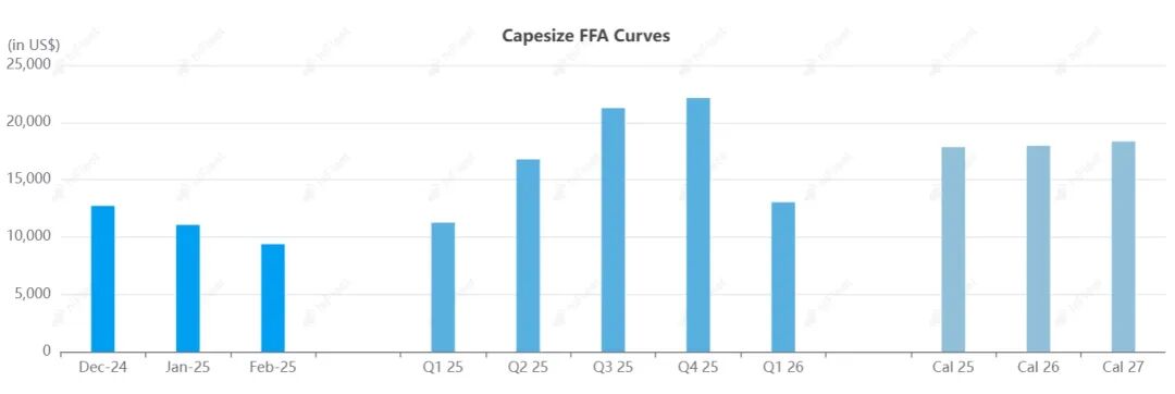 尽管中国政府在最新会议中释放出将采取更为积极刺激措施的信号,但海岬型船期货市场“并不买账”,依然下跌。 基于波罗的海交易所对海岬型型船 C5TC平均现货运费评估的1月远期运费协议(FFA)在周一下跌了4.4%,跌至11,050美元/填。而2月的合约跌幅更大,下降5.3%,降至每日9,375美元。期货曲线的最低点出现在2月,而市场普遍预计3月会有一定程度的反弹。