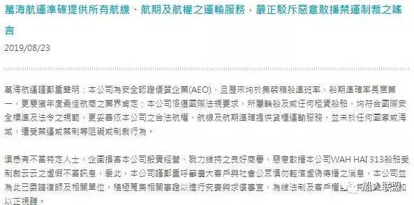 针对有消息称,万海航运旗下船舶“WAH HAI 313”受到制裁,万海航运8月23日发布声明辟谣。
