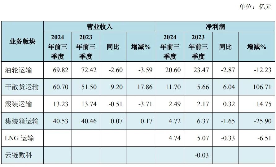 2024年前三季度,招商轮船各业务板块(CLNG船队不并表,招商气运、云链数科暂未产生营收)分部业绩如下: