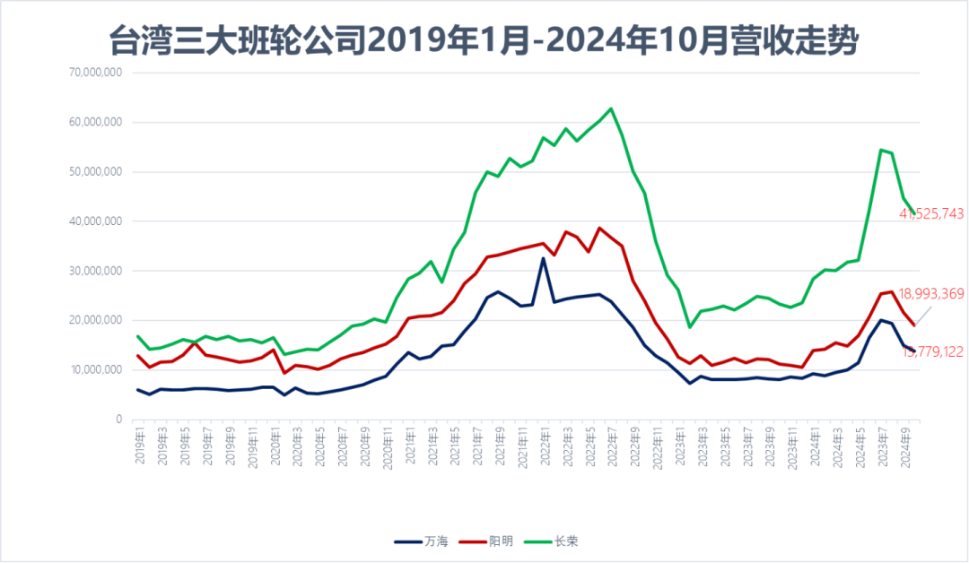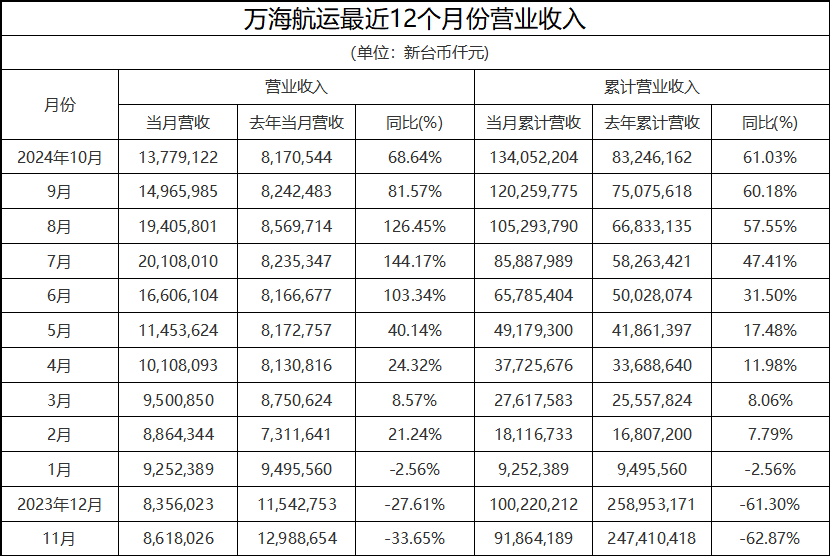 2024年前10个月,万海航运累计实现营业收入新台币1340.5亿元(约41.8亿美元),同比增长61.3%。