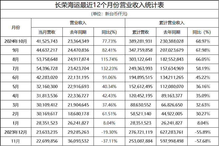 长荣海运2024年10月实现营业收入新台币415.3亿元(约12.9亿美元),同比增长77.7%,环比下降7.0%。