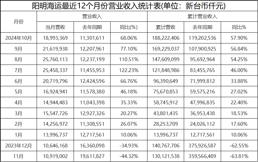 2024年前10个月,阳明海运累计实现营业收入新台币1882.2亿元(约58.7亿美元),同比增长57.9%。