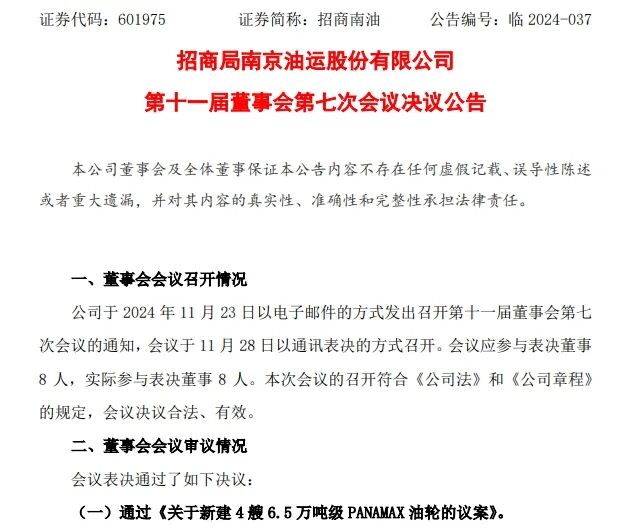 11月28日,招商局南京油运股份有限公司(以下简称“招商南油”)在第十一届董事会第七次会议决议公告中披露了最新新造船计划。