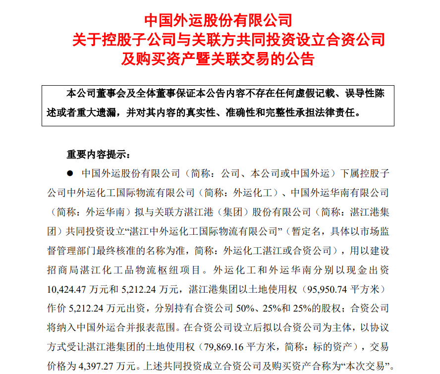 12月23日,中国外运股份有限公司(简称中国外运)发布关于其控股子公司与关联方共同投资设立合资公司的公告。 根据公告,中国外运下属控股子公司中外运化工国际物流有限公司(简称外运化工)、中国外运华南有限公司(简称外运华南),拟与湛江港(集团)股份有限公司(简称湛江港集团)共同投资设立合资公司,用于建设招商局湛江化工品物流枢纽项目。