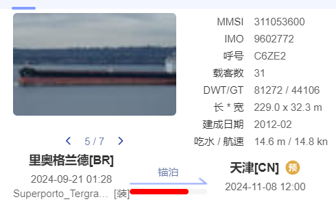 根据资料显示,该轮长229米,宽32.3米,载重吨81272吨,建造于2012年。从巴西装货后抵达新加坡加油,根据船视宝提供信息显示,该船昨天下午1540左右开始加油作业,两个小时后发生溢油。