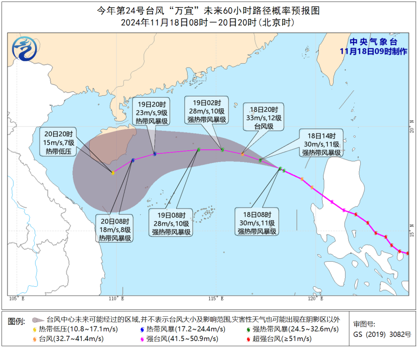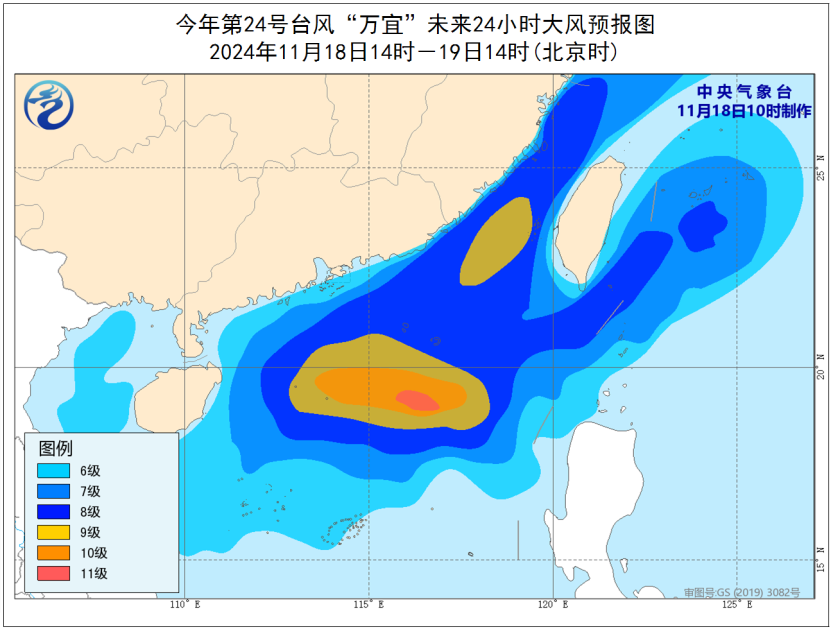 今年第24号台风“万宜”(强热带风暴级)的中心今天(18日)上午9点钟位于海南省三沙市(西沙永兴岛)偏东方向约630公里的南海中东部海面,就是北纬18.1度、东经118.1度,中心附近最大风力11级(30米/秒),中心最低气压为980百帕,七级风圈半径180-260公里,十级风圈半径90-120公里。 预计,“万宜”将以每小时15-20公里的速度向西偏北转偏西方向移动,强度维持或略有加强,最强可达强热带风暴级或台风级(30-33米/秒),并向海南岛东部海面靠近,19日起强度将快速减弱。 大风预报:18日14时至19日14时,受冷空气和“万宜”的共同影响,南海北部和中部、巴士海峡、台湾海峡、台湾以东洋面、东沙群岛、中沙群岛、西沙群岛、北部湾、福建沿海、台湾岛沿海、广东沿海、海南岛东部和南部沿海将有6-8级,阵风9-10级的大风,其中台湾海峡、南海北部风力有9级,阵风10-11级,台风中心经过的海域或地区风力有10-11级,阵风12-13级。