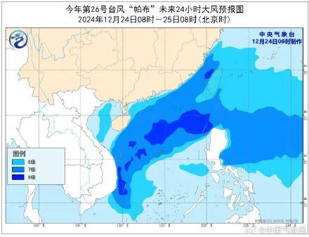 海南省气象台预计,受冷空气和台风“帕布”共同影响,12月23日夜间~24日,西沙群岛附近海面,风力8~9级、阵风10~11级;南沙群岛附近海面,风力7~8级、阵风9级;琼州海峡、北部湾海面和海南岛西部海面,风力5~6级、阵风7~8级。