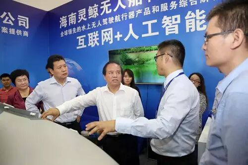 ▲省长刘赐贵,市委书记孙新阳、副省长何西庆等领导听取灵鲸无人船科技公司任佳博士关于无人船项目的介绍