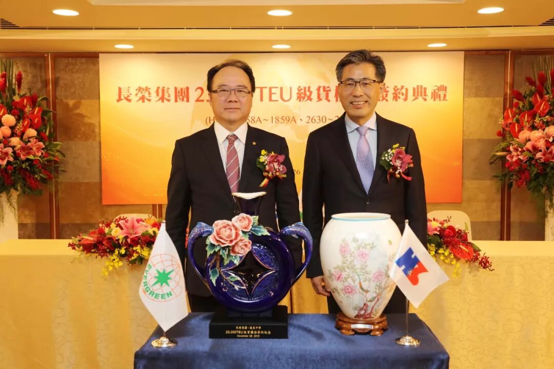 沪东中华介绍到,11月 26日下午,中国船舶集团旗下沪东中华造船(集团)有限公司和江南造船(集团)有限责任公司与长荣集团在台北市各签订2艘23000TEU超大型集装箱船建造合同。长荣海运董事长张正镛、总经理谢惠全、首席副总经理吴光辉,中国船舶工业贸易有限公司董事长李洪涛,沪东中华党委书记、董事长陈建良,江南造船党委书记、董事长林鸥等出席签约仪式。