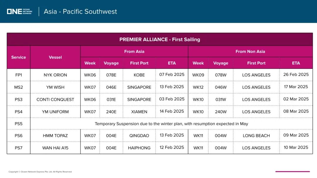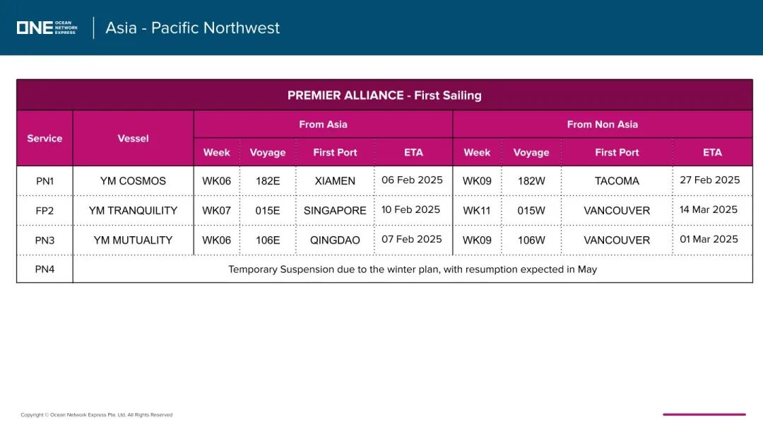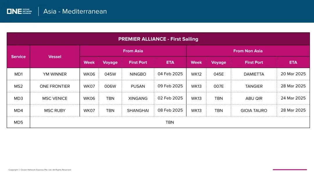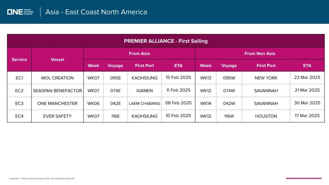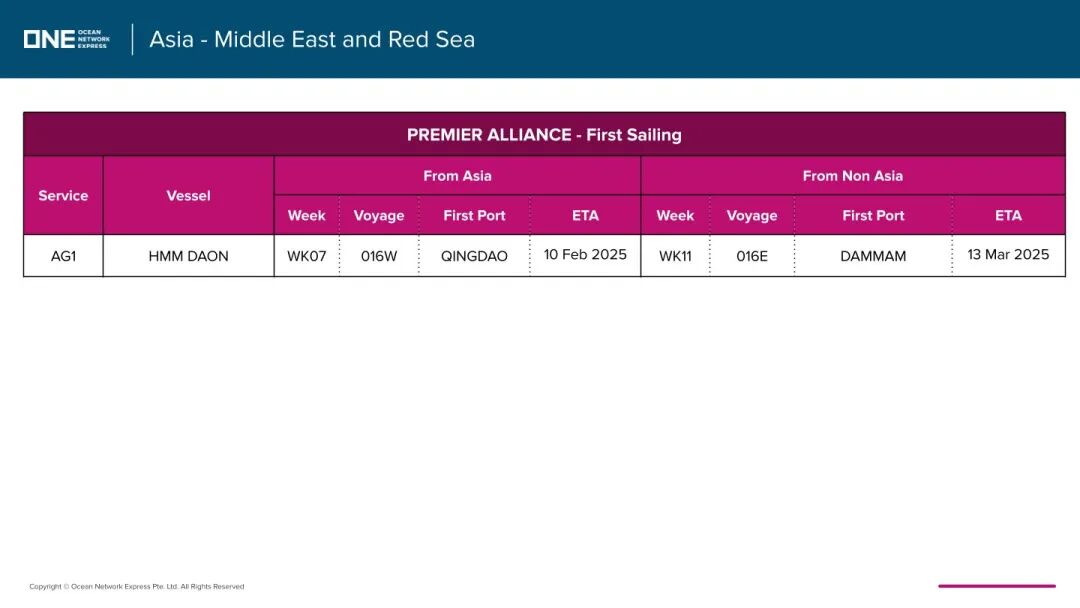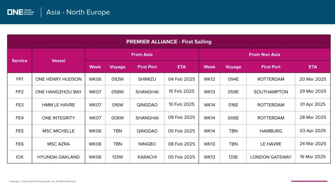 在“双子星”联盟宣布上线的6天后,另一大联盟同样宣布其旗下航线即将开启首航。 12月6日,海洋网联船务(Ocean Network Express,简称ONE)宣布即将开启Premier Alliance服务的首航,航线覆盖亚洲至欧洲、跨太平洋以及亚洲至中东的主要贸易航线,同时公布首航细节内容: 亚洲至北欧 亚洲至地中海 亚洲至太平洋西南部 亚洲至太平洋西北部 亚洲至美国东海岸 亚洲至中东和红海 Premier Alliance由ONE、HMM和阳明海运三家公司组成,全球班轮公司运力排名中分别位居第6、第8和第10名。三家公司目前共持有约65艘船、80.5万TEU的新船订单,合计占有市场份额为11.4%。 上周二,马士基和赫伯罗特正式开放“双子星”联盟(Gemini Cooperation,以下简称“双子星”)所有航线的预定,该联盟将部署59条航线,包括29条干线和30条穿梭航线。船队将由约340艘船只组成,其中许多船只已准备好采用更清洁的燃料,总运力接近370万标准箱。(详情请见:“双子星”联盟,正式上线) 虽然Premier Alliance的市场份额不及MSC和马士基等航运巨头,但通过Premier Alliance和与MSC的合作,三家公司有望在未来几年内进一步提升其行业地位和市场影响力。