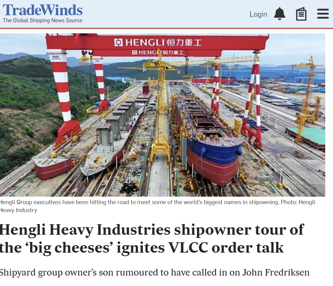 本周,市场传闻John Fredriksen已拿下恒力重工母公司恒力集团手持VLCC订单中的剩余6艘,每艘价格1.18亿美元。