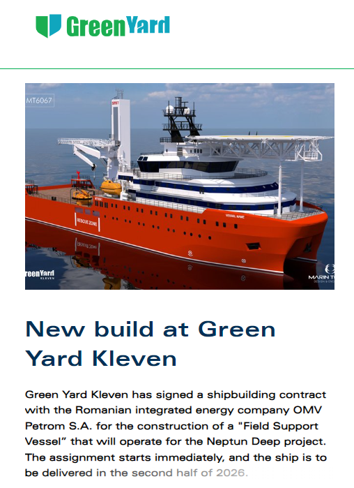 Green Yard Kleven首席执行官Hans Jørgen Fedog表示:“自2020年接管该船厂以来,我们始终致力于通过承接适合我们的项目,在新造船市场中稳固地位。因此,我们对此次获得的合同感到非常高兴。OMV Petrom选择我们承接这份合同,也让我们倍感荣幸。这是一次极具价值的合作,建立在双方深厚的信任基础之上。”