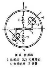 液体连通器式罗经的灵敏部分由陀螺马达和托架组成,采用钢丝悬吊,利用水银器的负摆效应产生控制力矩。下重式罗经的灵敏部分系一密封陀螺球,球内装有两个参数相同的陀螺马达、灯形支架和阻尼器等构件(图8)。两个陀螺马达垂直地支承在灯形支架上,用曲柄连杆和弹簧互相连接,并分别与陀螺球主轴南北线成45°夹角。借助这种装置,两个陀螺马达只能同时绕其垂直轴作相反方向、相同角度的转动,但转角很小。因此,它们合成动量矩矢量始终与陀螺球主轴南北线一致,类似单转子作用,用两个陀螺马达可以有效地消减摇摆误差。