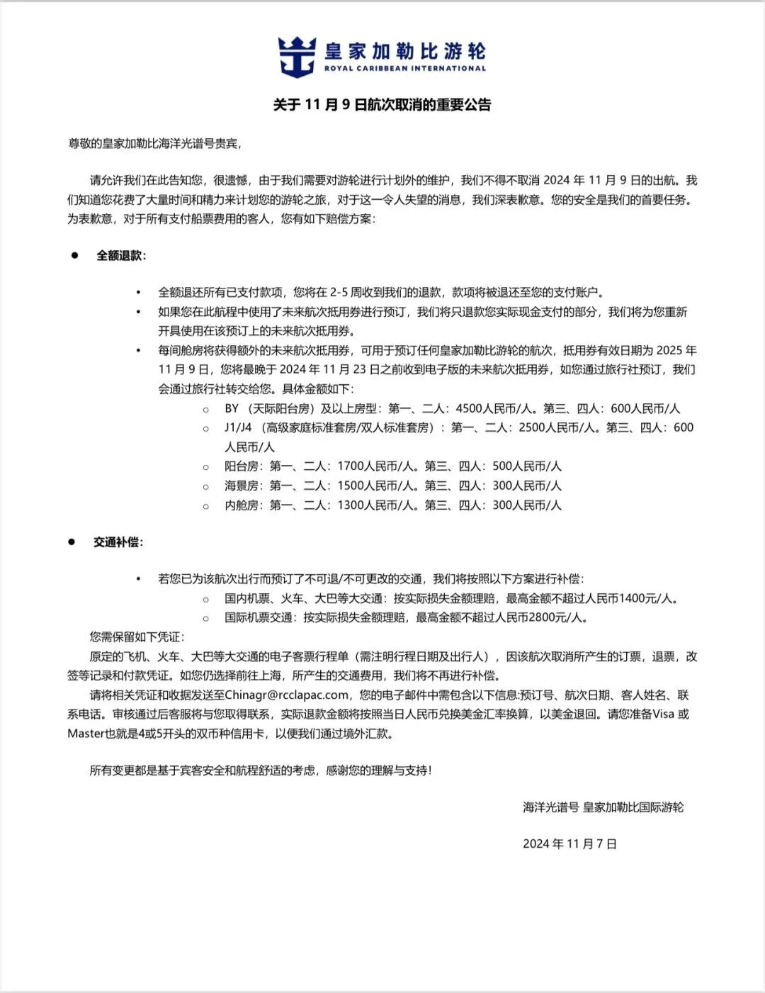 皇家加勒比公司亦发布公告,宣布由于需要进行计划外的维护工作,原定于2024年11月9日的航次被取消。