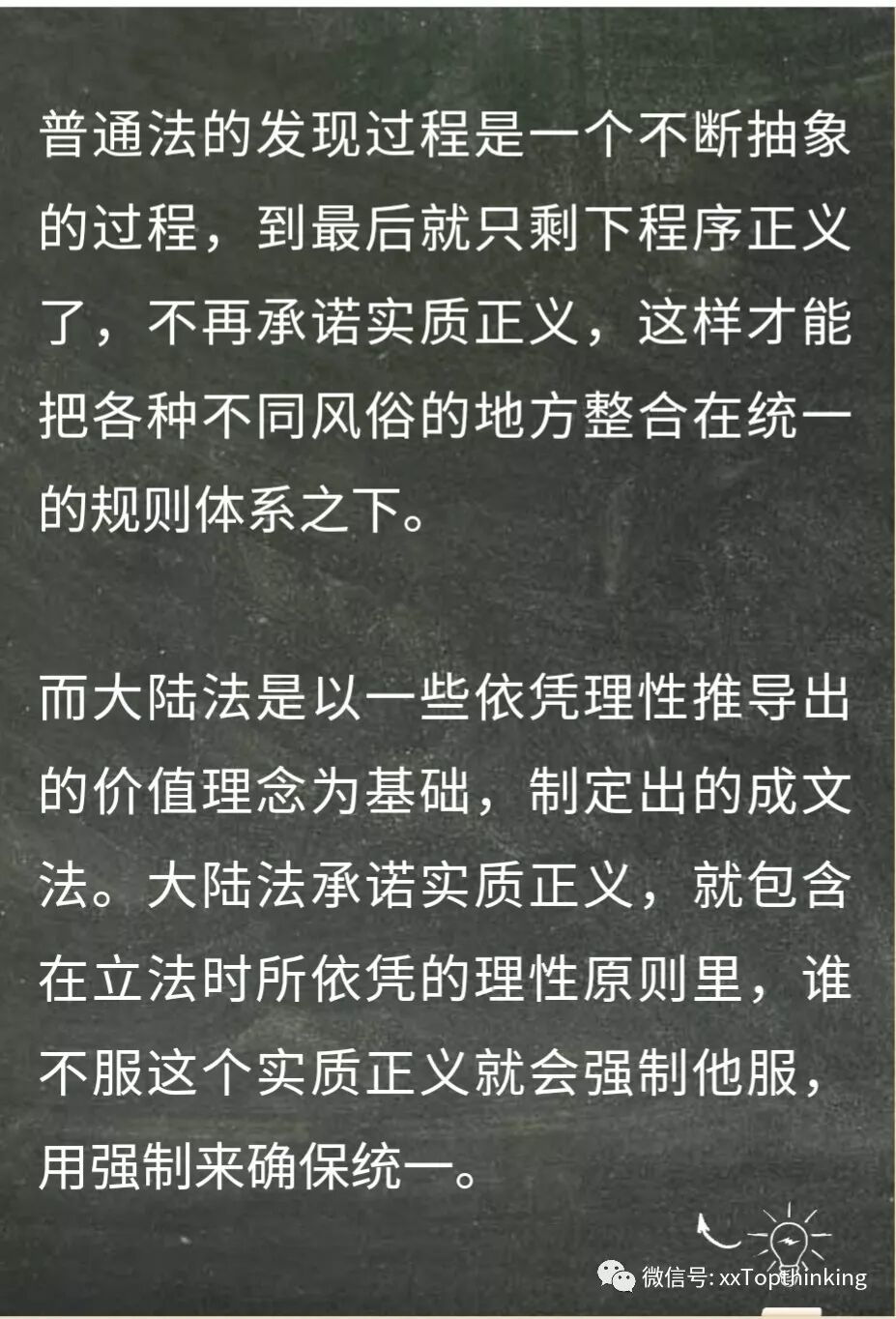 后来英国的普通法在初审法院层面,诉讼双方的是非曲直是由陪审团裁定的,法官只是在陪审团认定一方有罪错之后,来依据具体的适用法律判罪罚钱。陪审团成员从初审法院的周边社区里遴选,他们对于案件不做法律判断,只做事实判断,因而只是体现本地的公序良俗或社会传统。这样就会出现同样的案子在不同地方有不同结果。上诉法院会假定初审法院所做的事实判断是没问题的,因而只做法律判断,只评判初审法院在法律适用上是否有问题。由此,上诉法院就必须从几个诉讼中抽象出一些共同的原则。普通法经过这样不断抽象的过程,逐渐就只剩下程序正义。因而,英国普通法把实质正义放在初审法院这个层面上,基于地方性的公序良俗来实现;越进入到高等级法院的时候,就越变成程序正义。而大陆法则承诺实质正义,就包含在立法时所依凭的理性原则里,谁不服这个实质正义就会强制他服,用强制来确保统一。