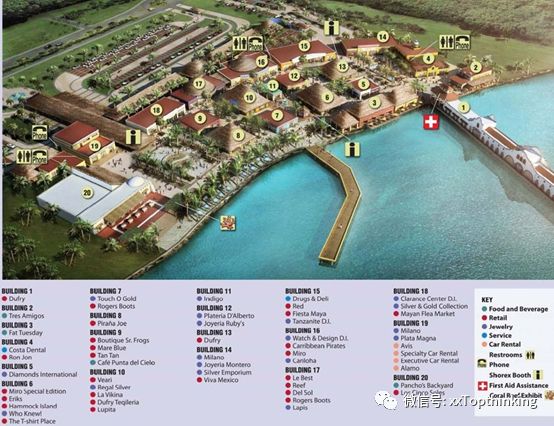 购物中心包括众多免税商店(豪华珠宝、手表、名牌服装)、当地制造的商品(礼品、纪念品)、食品和饮料设施。代表商店品牌的名单包括钻石国际、坦桑尼亚国际、银商场、杜弗里、哥伦比亚祖母绿、埃菲、古德马克、食人鱼、迪兹驴、德尔索尔、罗恩乔恩冲浪店、乔尔和杰克、靛蓝珍珠、金匠。